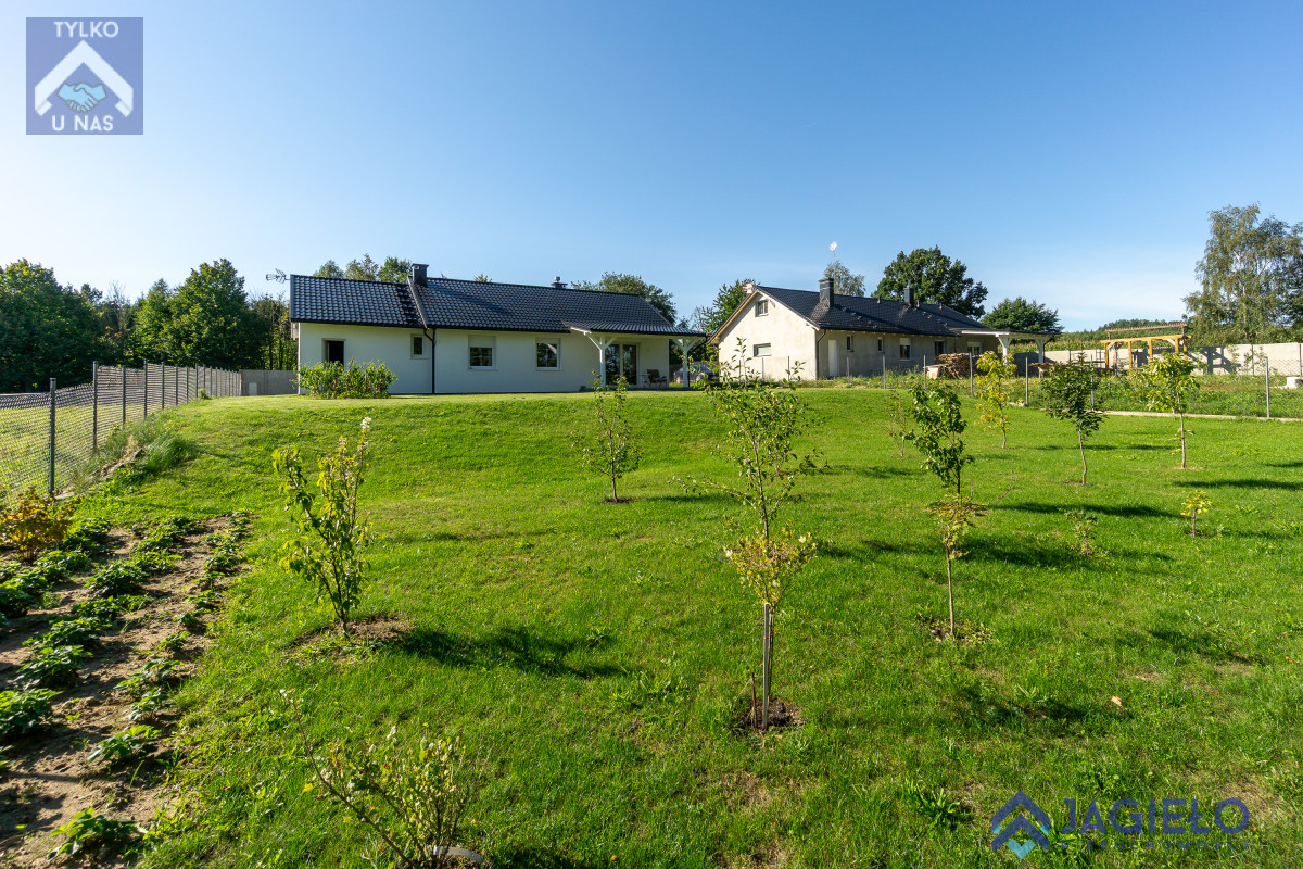 Ogrodzona z wydzieloną częścią ogrodową z drzewkami owocowymi.