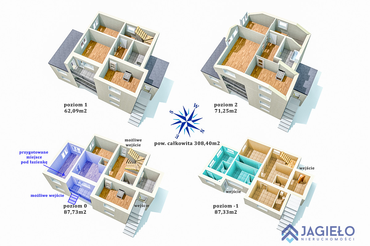 Dom posiada dwa niezależne wejścia - istnieje możliwość zrobienia trzeciego i zamknięcia klatki schodowej tworząc 4 niezależne mieszkania.