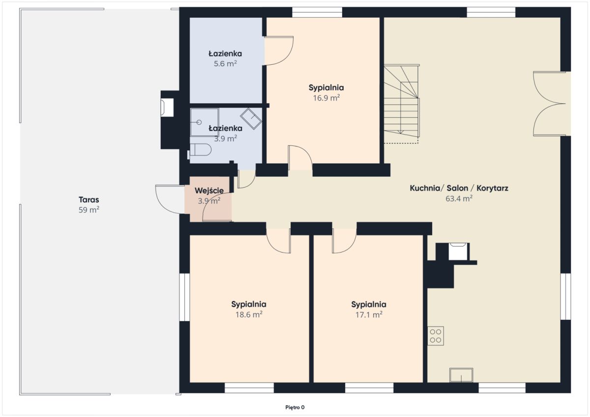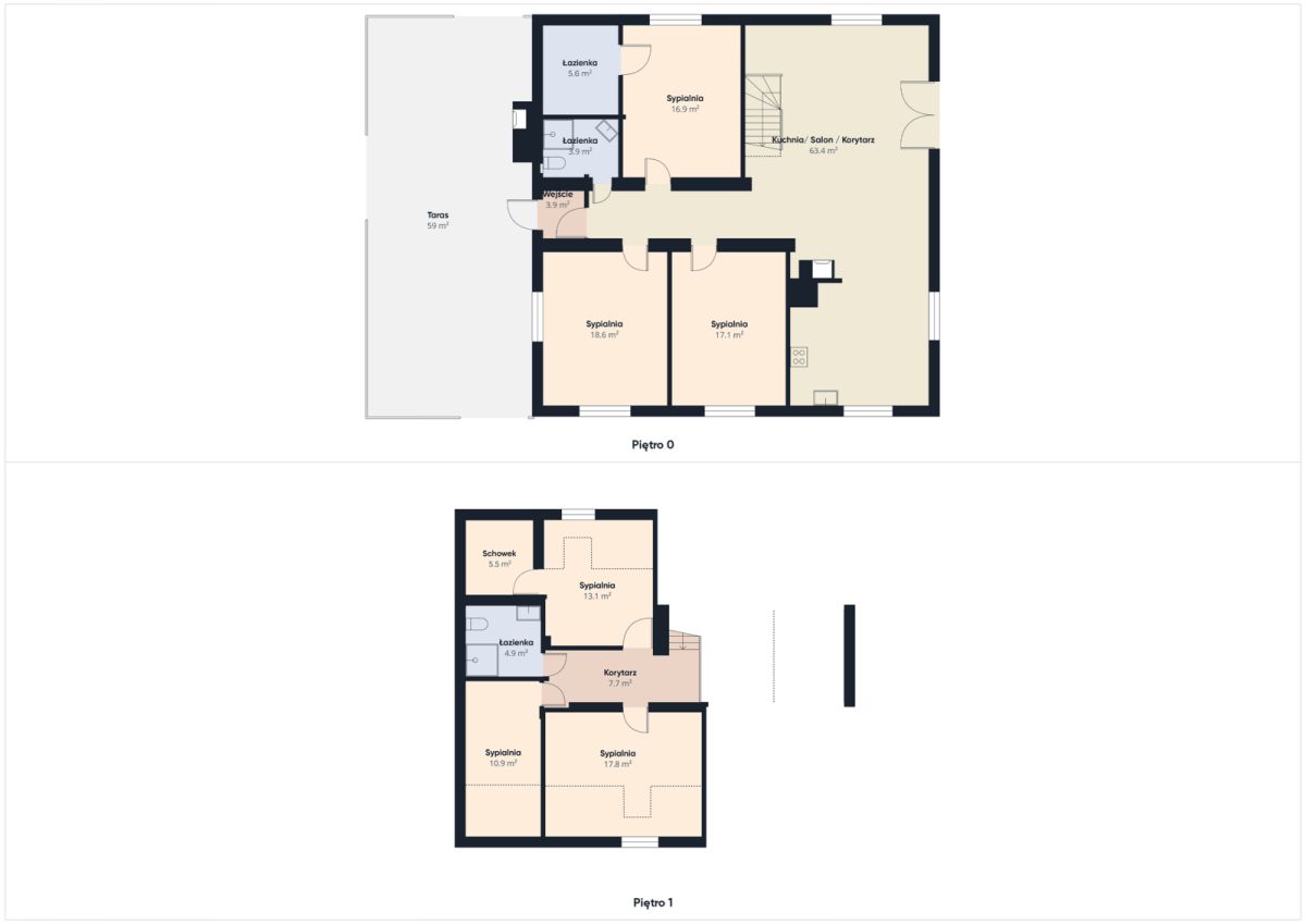 Parter i piętro to w sumie 7 pokoi, duża kuchnia oraz 3 łazienki.