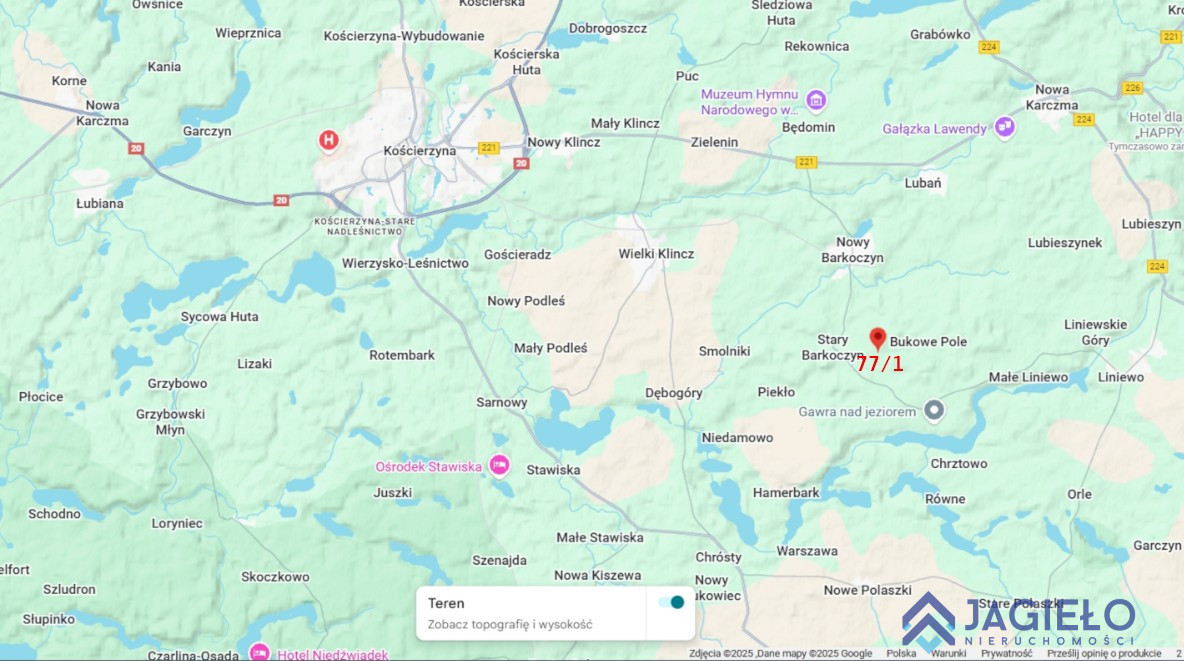 Działka znajduje się w miejscowości Stary Barkoczyn pomiędzy Nową Karczmą a Kościerzyną. Do Nowej Karczmy tylko 9 km, do Kościerzyny ok.15 km. W okolicy sporo jezior, najbliższe Jezioro Szopskie za ścianą lasu w linii prostej ok. 300 m, drogą gminną ok. 700m. Duże Jezioro Sobądzkie w odległości tylko 3km.