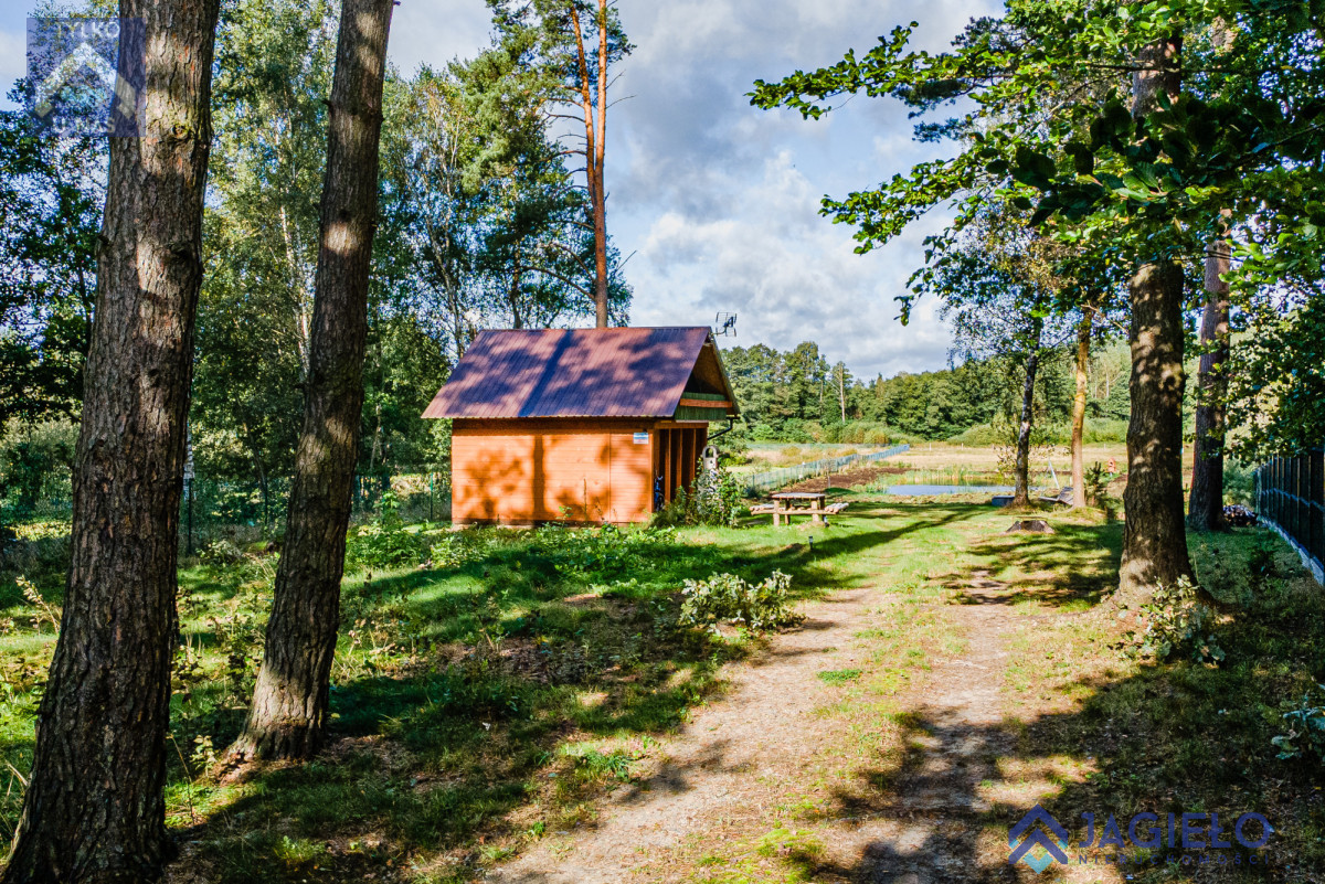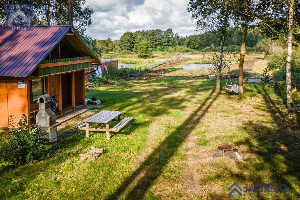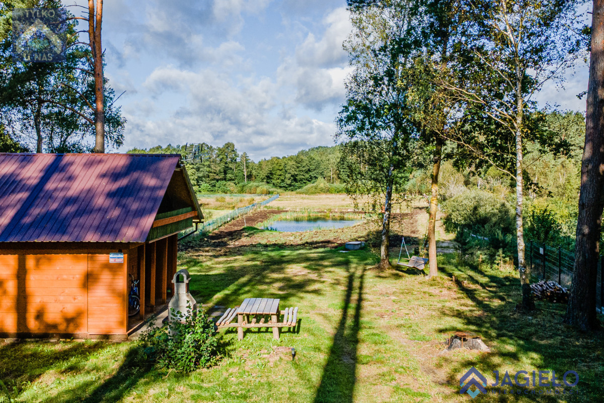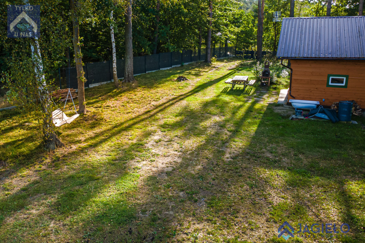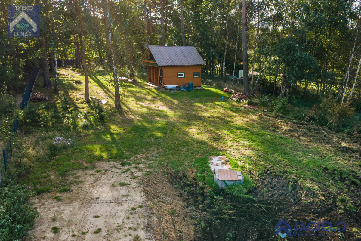 Działka z drewnianym domkiem w cichym miejscu z własnym kawałkiem lasu.