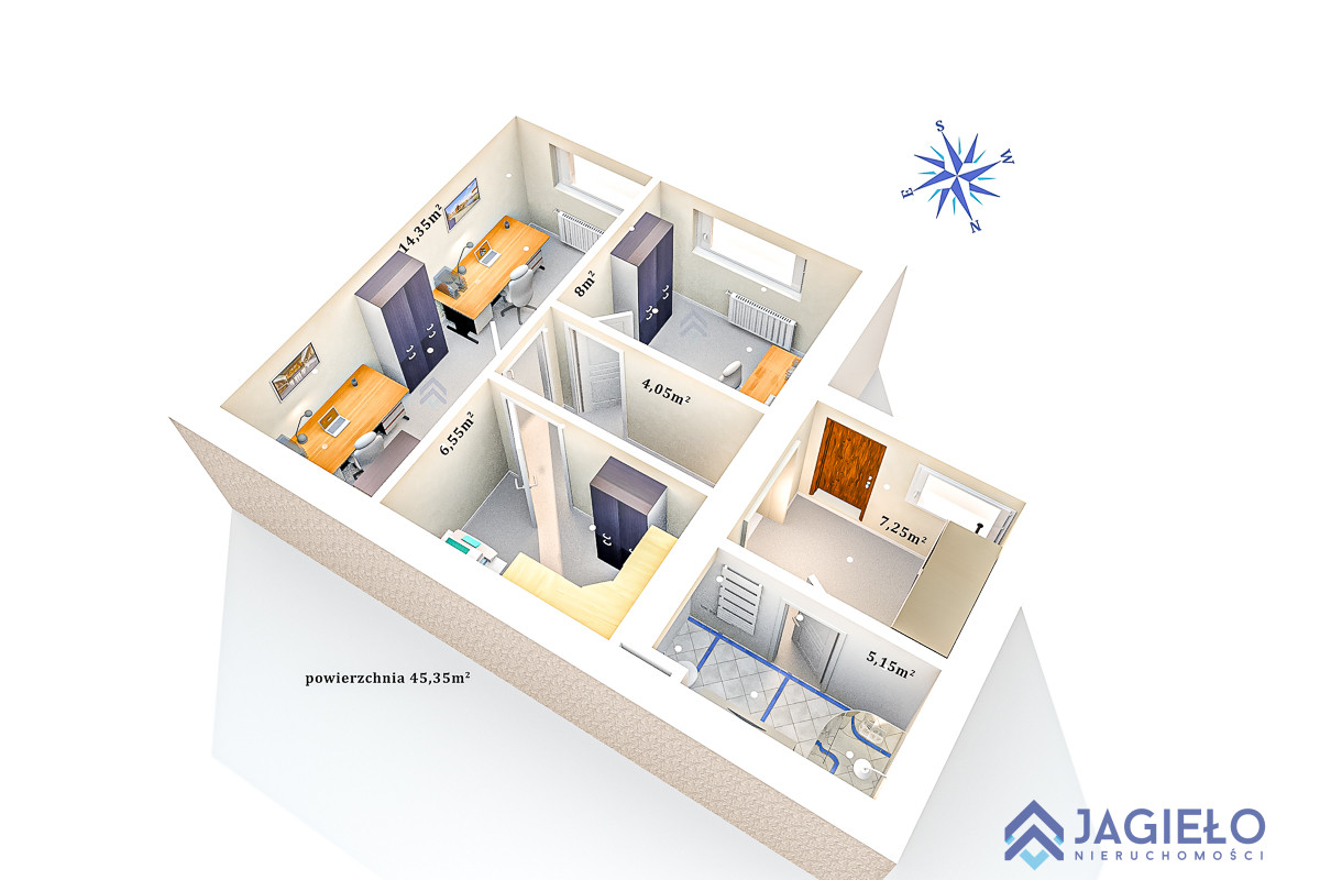 Jest możliwość usunięcia ścianek działowych, wówczas tworzy się nam przestrzeń 32,95m2