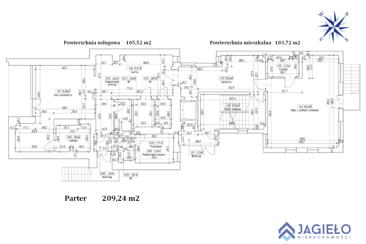 Piętro 209,43m2, w całości powierzchnia mieszkalna: 3 sypialnie(59;49;13m2), 3 łazienki, pomieszczenie pamiątek (22m2), pomieszczenie gospodarcze, korytarz