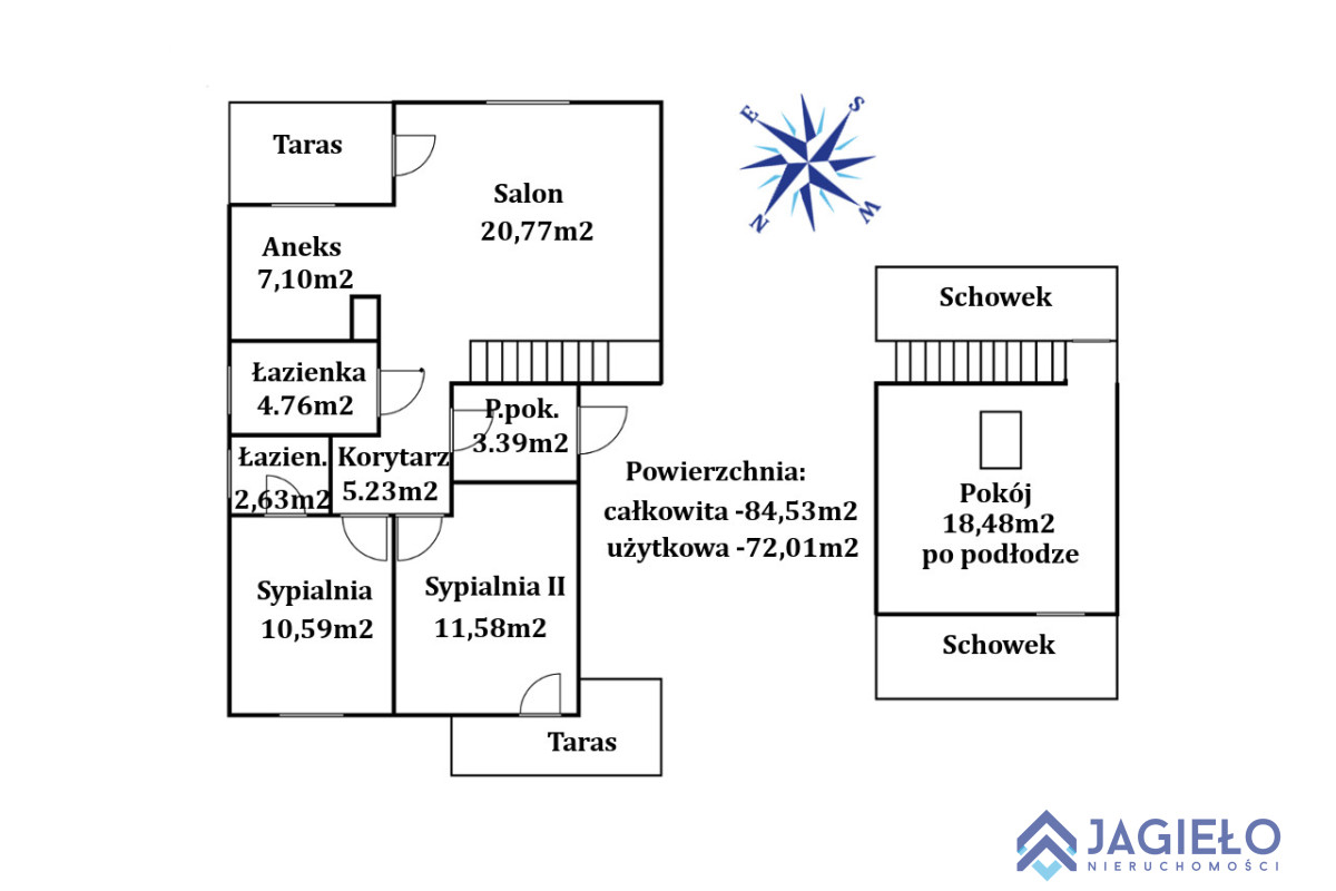 Dodatkowo dwa pomieszczenia gospodarcze na strychu(schowki) poza powierzchnią mieszkania.